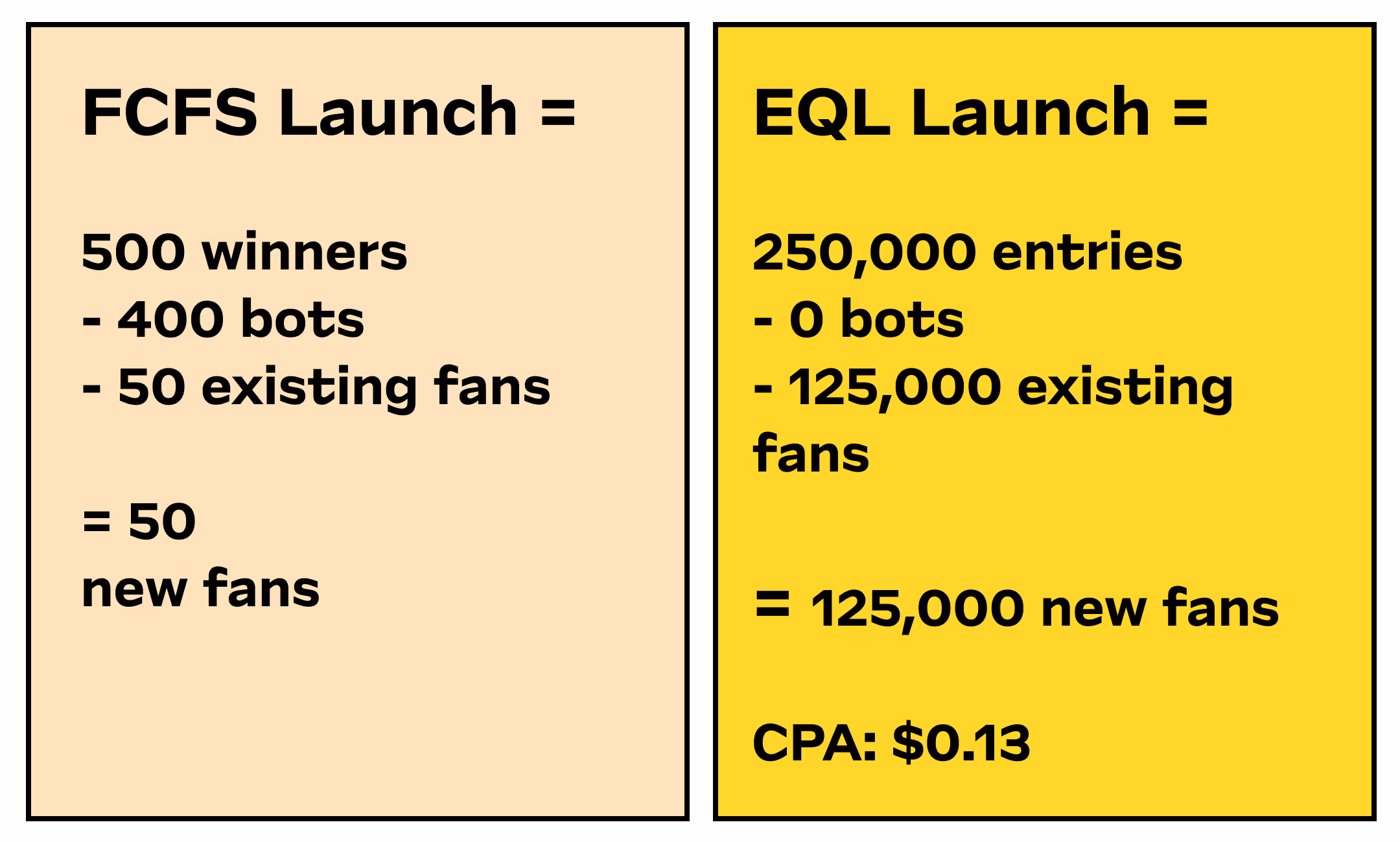 Not anymore. EQL launches create a longer window for existing customers and new fans to express their intent to buy. Winners are chosen, and whilst not everybody wins, they have all had the opportunity to purchase and nobody had to waste time in a queue, (which I’d say is a bit of a win on its own). Those who were not selected are not invisible. You’ll have the opportunity to engage with them in the future (EQL launches see an 80% marketing opt-in rate). Also, gathering new customer profiles means nothing if over half of them are bots — it just fills your CRM full of junk. EQL filters out the bots and bad actors, leaving you with clean data on who is motivated to buy.